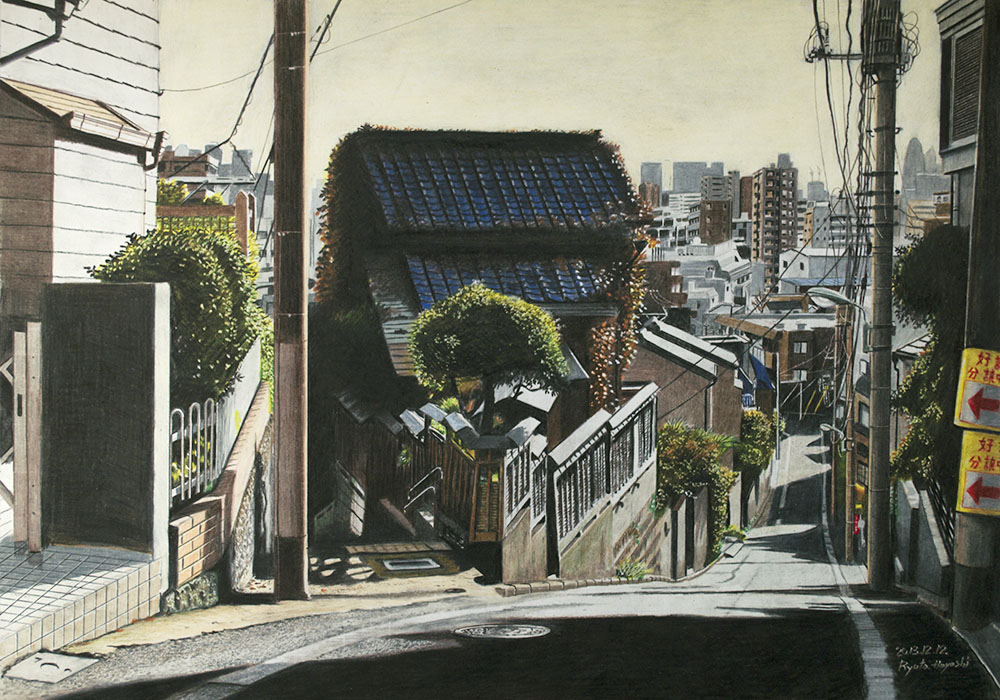 午後の富士見坂 豊島区高田/色鉛筆(カリスマカラー)/2013年12月/B3(KMKケント紙)/瓦屋根のある風景 その12。 場所は目白通りの富士見坂。夕日に輝く瓦屋根越しに新宿の遠景。 #色鉛筆画 #林亮太 #風景画 #みんなで色鉛筆イラスト見せ合おうよ ryota884.thebase.in/items/58858326 ryota-hayashi.com/?p=710