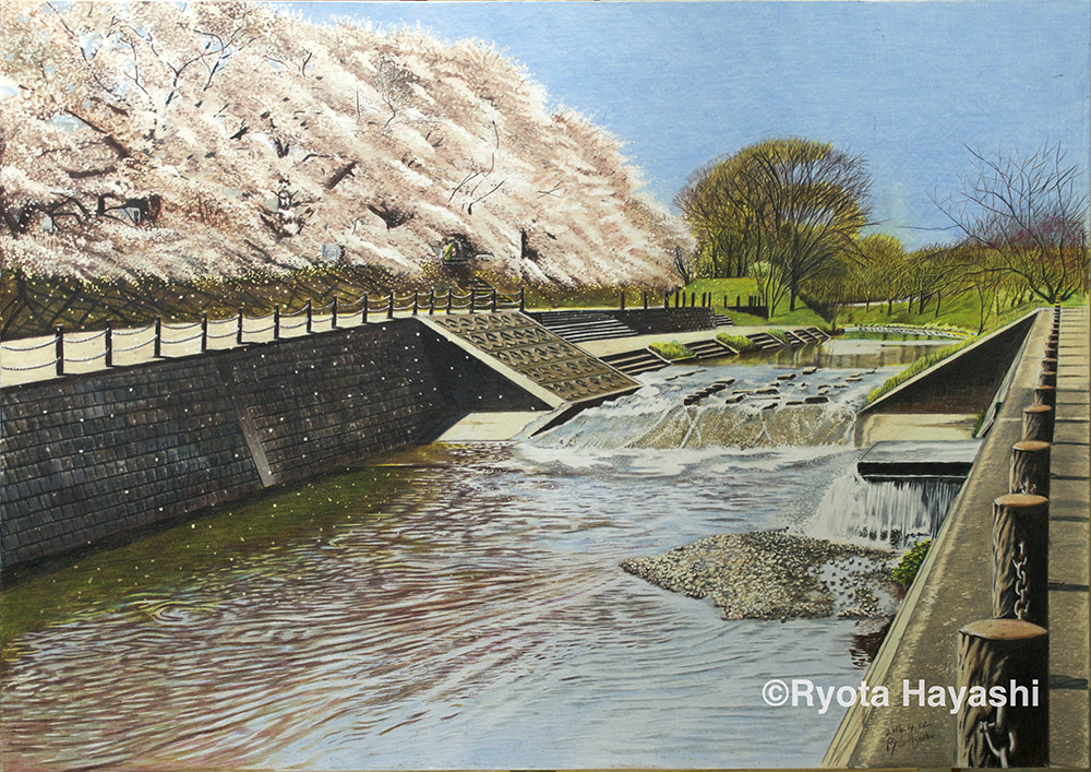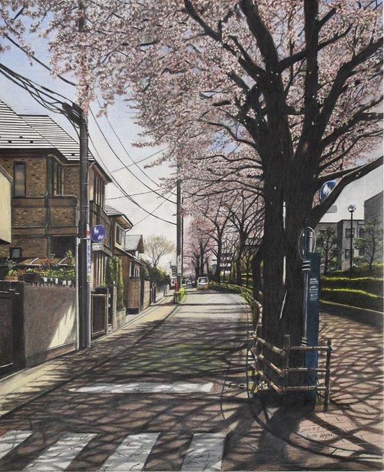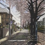 春の道 中野区上鷺宮/色鉛筆(カリスマカラー)/2012年4月/A2(muse KMKケント紙)/木漏れ日の風景 その6 桜並木の木漏れ日は春の光に溢れて。 #色鉛筆画 #林亮太 #風景画 #みんなで色鉛筆イラスト見せ合おうよ ryota-hayashi.com/?p=265