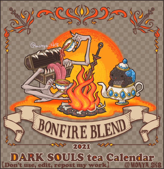 6月【冷たい谷のイルシールティー〜エルドリッチブレンド〜】 神喰らいと法皇のティータイム。 飲んだら冷えそうな感じもするし温まりそうな感じもしますね。ハーブティーでミントとかジンジャーとかはいってそう #Darksouls #もにゃ絵