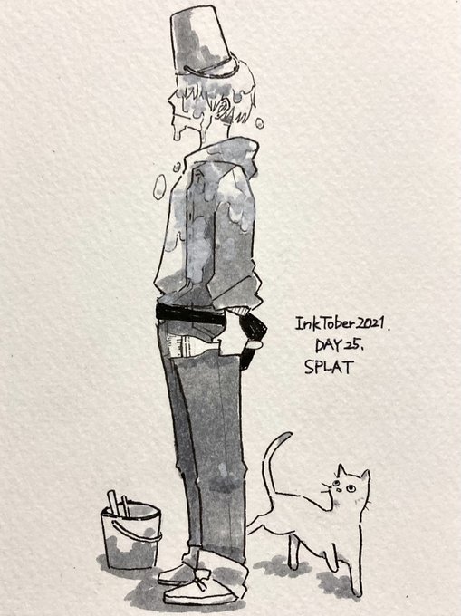 【#ゆめ画材インクトーバー2021 25日目】 ペン:ZIG イラストレーション ベーシックセット IKTB-21/5V 紙:水彩紙(モデラトーン) お題はSPLAT(しぶき)。白ペンがうまく使えた気がします。 「危ない!」って言われた方向に顔上げたらペンキかぶった人。 #inktober #inktober2021