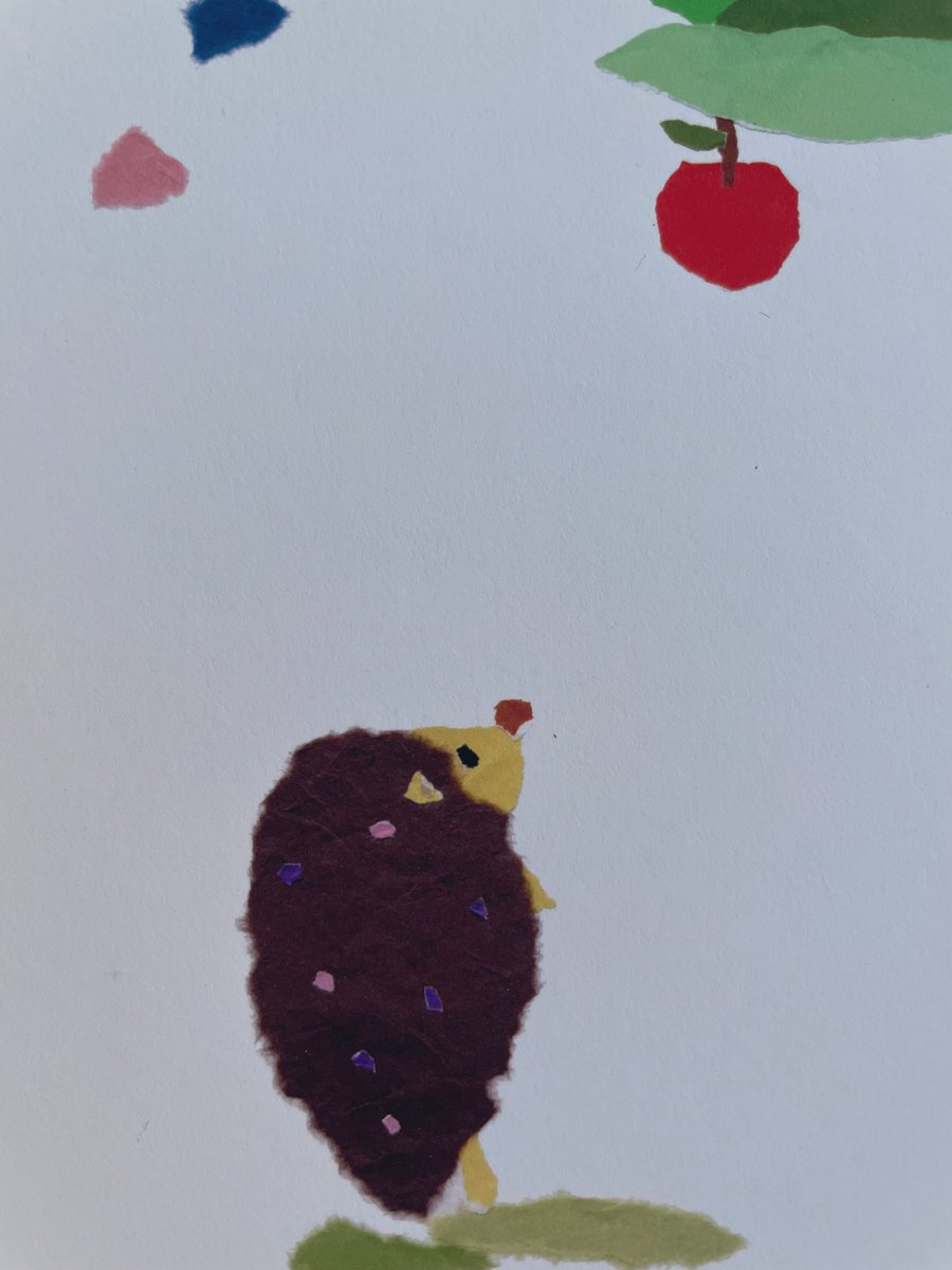 ちぎり絵で作った作品です。 「リンゴ落ちないかな」 #ハリネズミ #りんご #イラスト #イラスト好きな人と繋がりたい #紙作品 #オリジナルアート #illustration #paperart