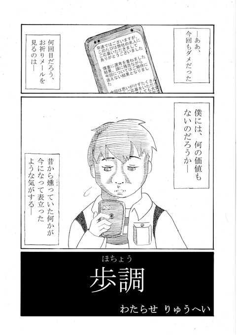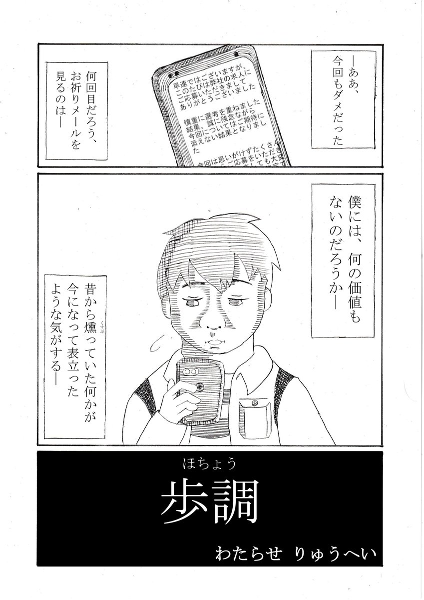 【創作漫画】歩調 twitterに漫画を初投稿。 5月にpixivのコンテスト用に描いた漫画を載せます。 大学時代の就職活動を思い出しながら描きました。 タイトルは、レミオロメンの曲を聴いているときに、構想を思いついたから。 #漫画が読めるハッシュタグ #創作漫画 #わたりゅう創作漫画