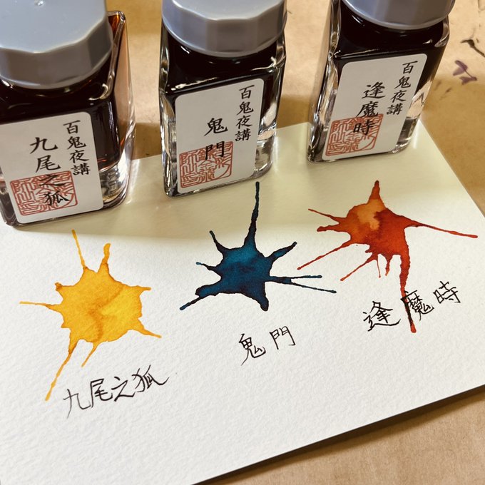 【あと26日!】 #インクイラスト合同誌 「#インク・ミュージアム」の発刊カウントダウン。 本日はカラーバーインクや長崎美景などのオリジナルインクを生み出している「#石丸文行堂 」(@140_ishimaru)から4色をご紹介します!「岩下の新生姜」は色と香りが生姜という斬新なインクです! #インク沼