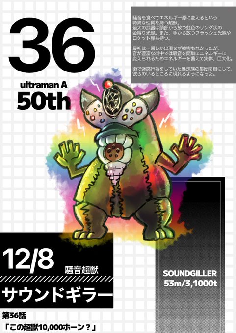 個人的な事情により二週間くらいあいてしまったけど、まとめてドンと騒音超獣 サウンドギラー、鈍足超獣 マッハレスの50周年絵を載せておくよ! この辺の超獣って若干印象薄めだよね。なんでかっていうと、要素が色々かぶってるからなんだよ(ストーリーは割と温度差あるよ)。 #ウルトラマンA50周年
