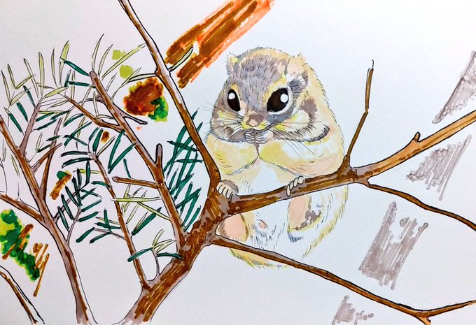 #梅雨ですしゆっくり作品をみませんか #エゾモモンガ #コピック #アナログイラスト #絵描きさんフォロバ100 #絵柄が好きっていう人にフォローされたい #絵描きさんと繋がりたい 北海道固有の動物 エゾモモンガ描いてます😊