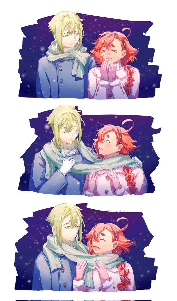 エラスレ/4号スレ お題:「見つめ合う」「マフラー」 是一起看下雪的可爱四狸!!! #水星の魔女 #G_Witch #機動戦士ガンダム水星の魔女 #スレッタ・マーキュリー #エラン・ケレス #エラスレワンドロライ4