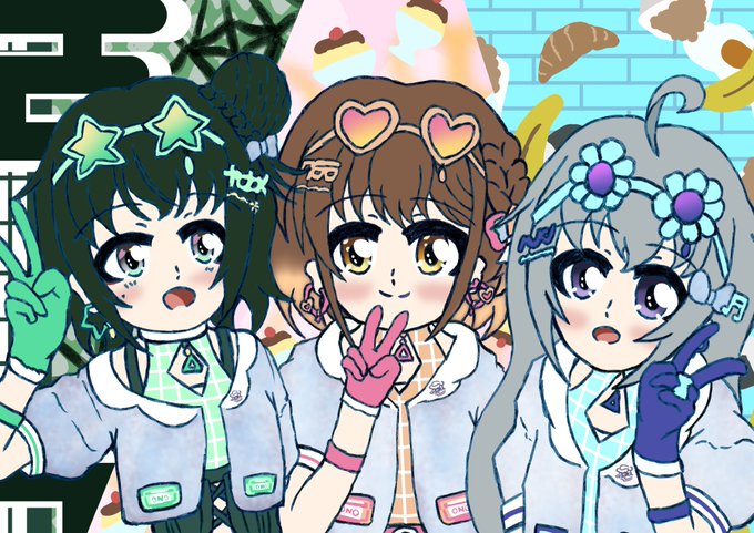 #clara_art #カナメアルバム #ヘノヘノハノン #pp_Sputrip #Sputrip2周年ライブ でお披露目の Starry☆Melody 衣装描いてみました、左からカナメちゃんクララちゃんハノンちゃんですとってもかわいいです!🥰 衣装デザインは愛原くく先生です✨