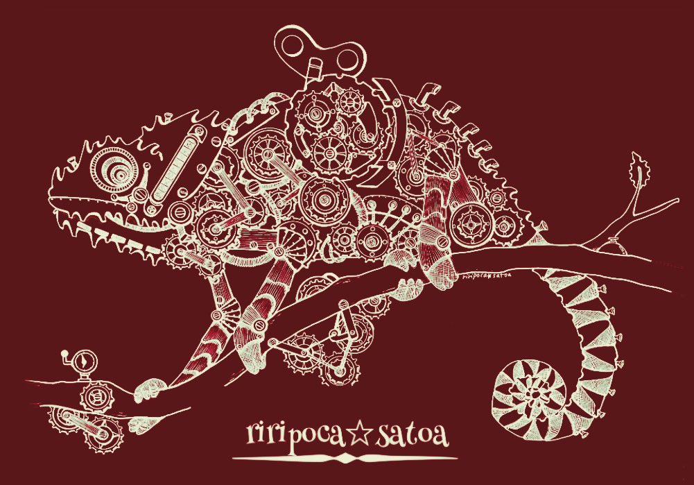 お疲れ様でした✨✨ ゆっくりお過ごし下さい♪♪♪ ⚙メカメレオン⚙ #スチームパンクイラスト #歯車イラスト #カメレオン #ペン画 #今日もありがとうございました #アトリエの系譜S #アトリエの系譜plus