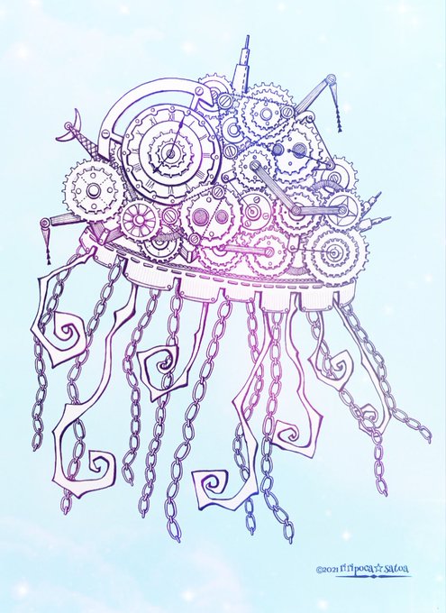 おはようございます(〃ω〃) 今日もよろしくお願いします♪ 新春社畜祭り開催中です(^◇^;) ⚙クラゲ⚙ #創作 #歯車イラスト #スチームパンクイラスト #ペン画 #クラゲ #絵描きさんと繋がりたい