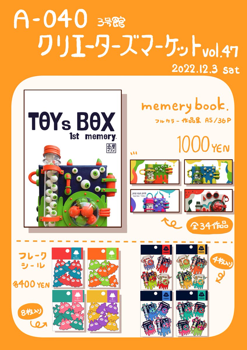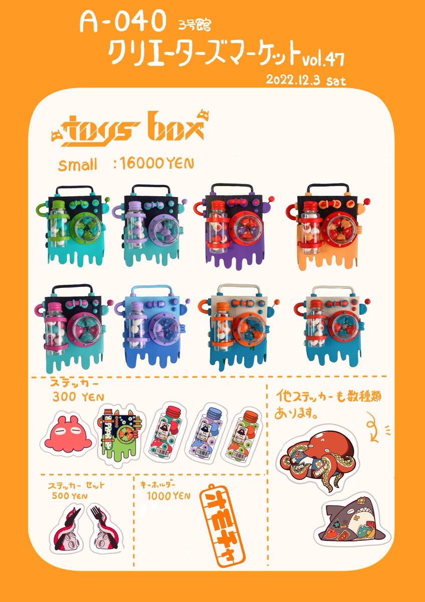 クリエーターズマーケット47に出展します! ブース番号:A-040 出展日:12/3(土) 出展名:壺屋のおもちゃ屋 飾って楽しむおもちゃ「toys box」を作っています💨 クリマ初参戦です!ぜひ遊びに来て下さい! #クリエーターズマーケット #クリマ