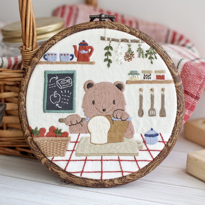 🌲森の喫茶店🌲 新作の壁飾りが完成しました。 森の奥深くにある喫茶店を舞台に描いています🐻🍞 イラスト×刺繍のNel bosco(ネルボスコ)から、原画:Raco、刺繍:orso ricamatoの2人で共同制作しました。 クリマにて販売いたします! #刺繍 #ハンドメイド #クリエーターズマーケット