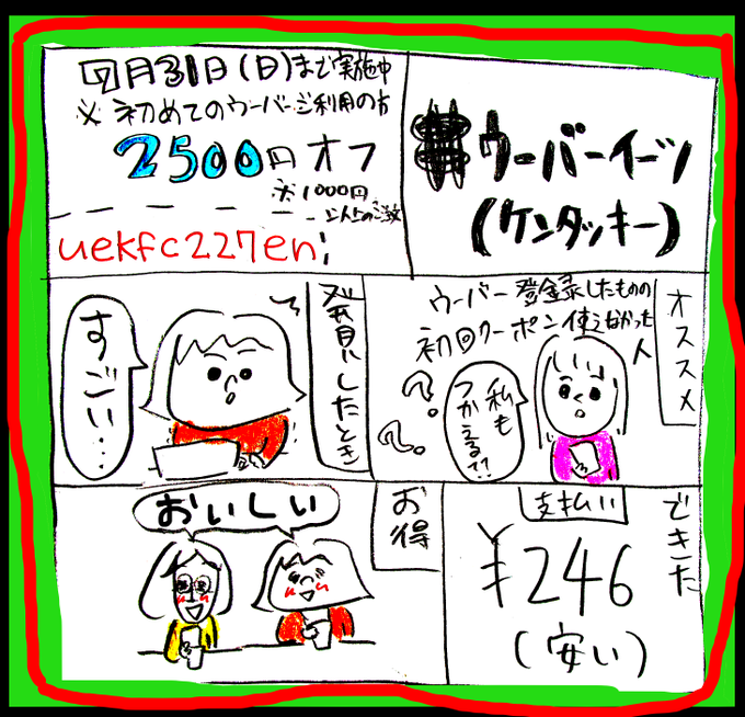 【#ubereats:#ケンタッキー】 初めてウーバーイーツをご利用の方2500円を使ってみました。 支払い・・・246円 <オススメ> ■初回クーポンを使い忘れた人 (ケンタッキーだけ使えるクーポン) #漫画が読めるハッシュタグ #コミックエッセイ