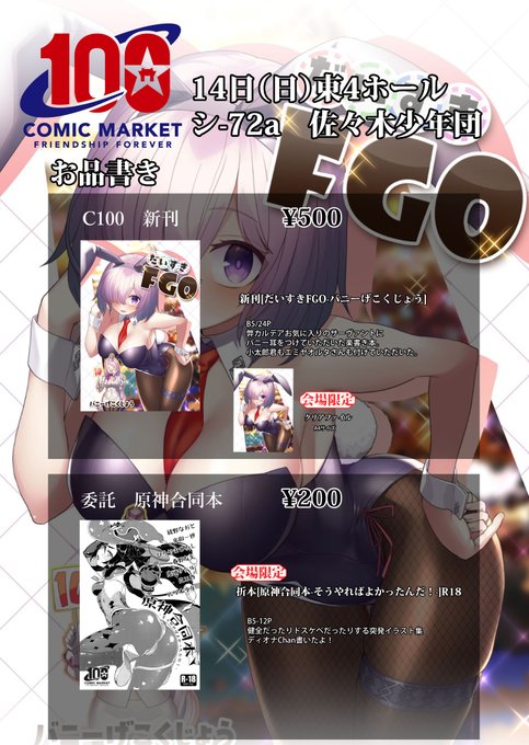 C100佐々木少年団の新刊「だいすきFGO バニーげこくじょう」は書店様にて予約開始しました。ご縁がありましたらばよしなに。 #コミケ100 #C100 🐯ecs.toranoana.jp/tora/ec/item/0… 🍈melonbooks.co.jp/detail/detail.…