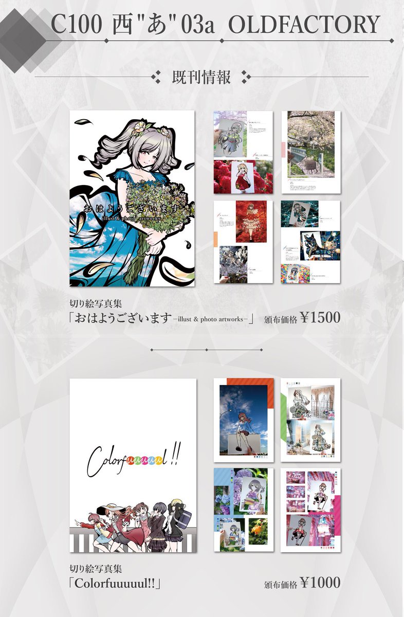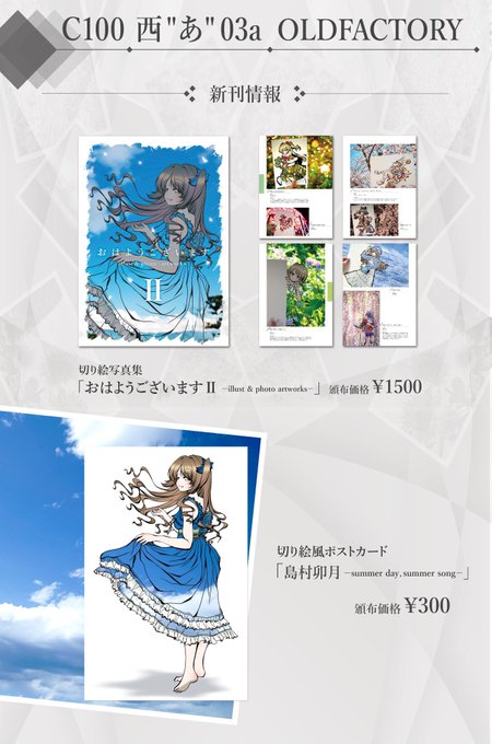 【#C100 拡散希望】 当日宣伝失礼します!本日コミケにて西「あ-03a」OLDFACTORY参加させて頂きます!新作にB5/フルカラー/24ページの作品集としまむーのポスカを用意しました。既刊もあるのでぜひ遊びにきて頂けると嬉しいです! #コミックマーケット #コミケ100