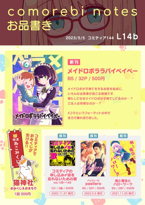 5/5の #コミティアお品書き です! 新作1つ目は漫画『メイドロボララバイベイベー』! メイドロボが子育てをしたりするお話です。 もう1つは可愛い猫のおみくじ🐱 iPadでおみくじを引いて、出てきた猫のおみくじとおまもりが貰えます⛩ 猫は全10種類、お気軽にどうぞ! #COMITIA144 #コミティア144