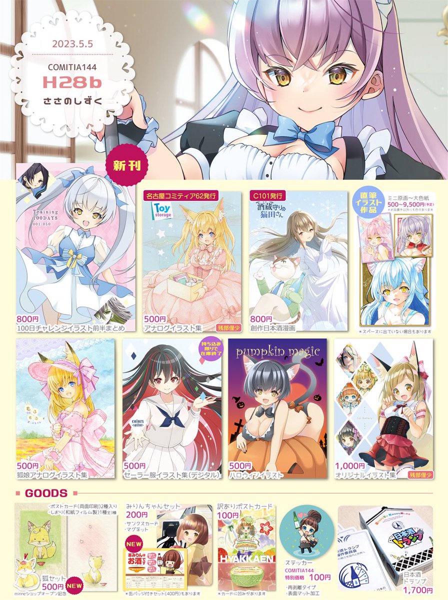 #コミティアお品書き 5/5 #COMITIA144[H28b]ささのしずく 新刊:デジタルイラスト本 初頒布:アナログイラスト本 新作グッズ・色紙等直筆作品あり ☀️fanboxに詳細まとめました→ sasatsuyu.fanbox.cc/posts/5847360 #コミティア144 #COMITIA144お品書き