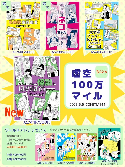 5/5東京ビッグサイト(11~16時)開催 #COMITIA144 お品書きです。 虚空100万マイル*ち02b 新刊は怖くない実話怪談漫画。 既刊はファンタジー長編漫画、JK魔女とネコのコメディ、太平洋フェリ~旅行記、名古屋お散歩本。 お気軽にお立ち寄り頂けると嬉しいです! #コミティア144 #コミティアお品書き
