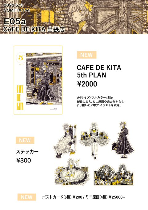 【 #COMITIA144 お品書き 】 イラスト集、新作ポストカード6種、ミニ原画4枚、その他既存グッズ等も頒布予定です。 スペースは E-05a / CAFE DE KITA 出張店 です。 よろしくお願いします。 #コミティアお品書き