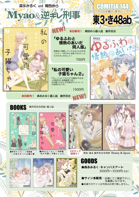 5/5コミティア144お品書きです🐾 東3・き48b「Myao」 袴田めらさん「逆ギレ刑事」と隣接合同会計になります。 「私の可愛い子猫ちゃん②」当日購入特典にポストカード差し上げます。 あとキャンバスアートを作ったので持っていきます✨ #コミティア144 #コミティアお品書き #COMITIA144