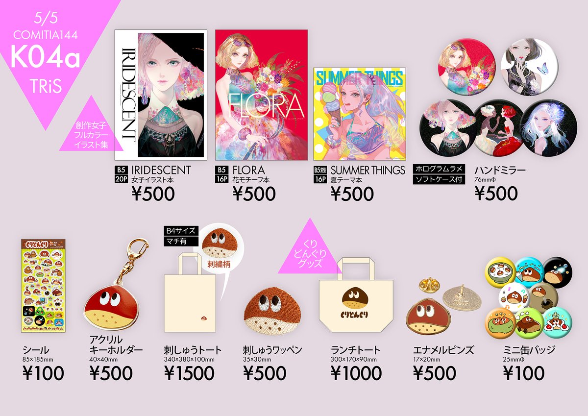 #コミティア144お品書き 5/5 東2【K04a】TRiS イラスト集と #くりどんぐり グッズ頒布します。 美女と栗屋と呼ばれている謎のごった煮サークルです よろしくお願いします🌸🌰 #COMITIA144 #コミティア144