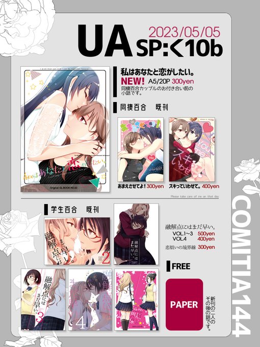 5/5のCOMITIA144に『UA』(配置:く10b)で参加しています。創作百合エリアです。 新刊は『私はあなたと恋がしたい。』(同棲百合カプの付き合う前の小話)。他に学生百合の既刊もそれぞれ持ち込みます。 当日はよろしくお願いします。 #コミティア144お品書き #COMITIA144