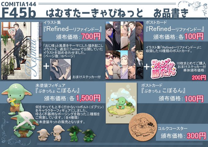 【 #コミティア144お品書き 】 スペース:東3ホール F45b サークル名:はむすたーきゃびねっと お品書きができました! 画像二枚目のポスターが目印ですよ(/・ω・)/ イラスト集、ポストカード、未塗装フィギュア、コルクコースターがあります! ぜひ見に来てね(n*´ω`*n) #COMITIA144 #コミティア144 twitter.com/i/web/status/1…