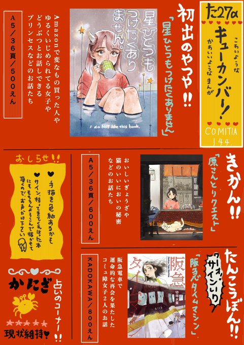 #COMITIA144 #コミティア144お品書き 大変長らくお待たせしました、COMITIA144のお品書きになります……! くっそ久しぶりの漫画になりますのでお手柔らかに、是非お手に取ってご覧下さいませm (現在新刊製本前のためページ数、値段に若干の変動があるかもしれません)