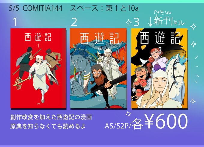 宇宙初解禁の『西遊記』新刊があるので天の川銀河全体に行き渡るよう拡散いただけると幸いです COMITIA144おしながき!あさって開催! ※ワンモタ6は143にも出したのでNEWではないです #コミティア144お品書き #COMITIA144お品書き #COMITIA144 #コミティア144 #創作