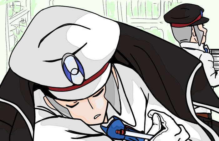 昨日の絵の続きをやるつもりが うっかり寝落ち! 起きたらこんな時間に! 12月初っ端の絵は 眼鏡のグラスコード仕事で必須になったのでそんな絵を描いてみたの絵 ヒモの位置間違えてるー 本当はもっと後ろだね 『ノボリかな?クダリかな?』 #サブマス #サブウェイマスター