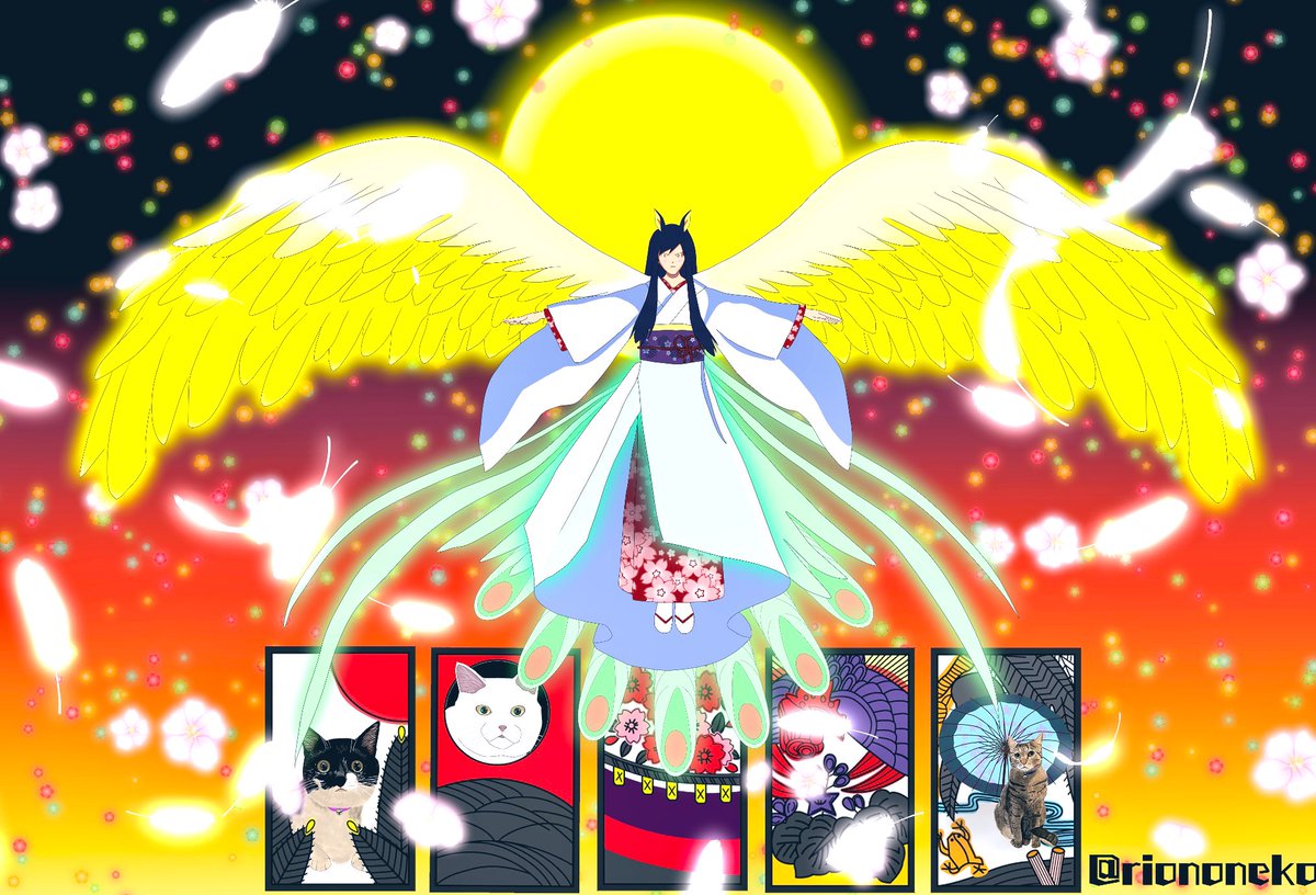 こいこい🎴 吉祥のアイテム纏ったナツキ。五光の役に、ウチのニャンズが紛れてる…😆💦✨ #イラスト好きさんと繋がりたい #猫好きさんと繋がりたい #絵描きさんと繋がりたい #アトリエの系譜 #サマーウォーズ
