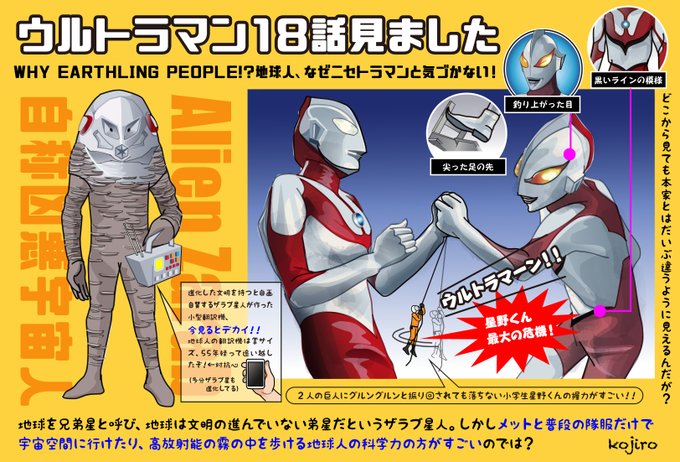 マン兄さん18話の感想画描きました。下書きを終えた後に二瓶さんの訃報を聞いたので今回イデさんがいないのですが。ニセトラマンのひ弱さに本家マン兄さんのスタイルの良さを再認識。ザラブ星人、インテリ宇宙人を名乗る割に作戦が甘い!超頑張れ! #初めての初代ウルトラマン 第18話 #ザラブ星人 twitter.com/50Orb/status/1…