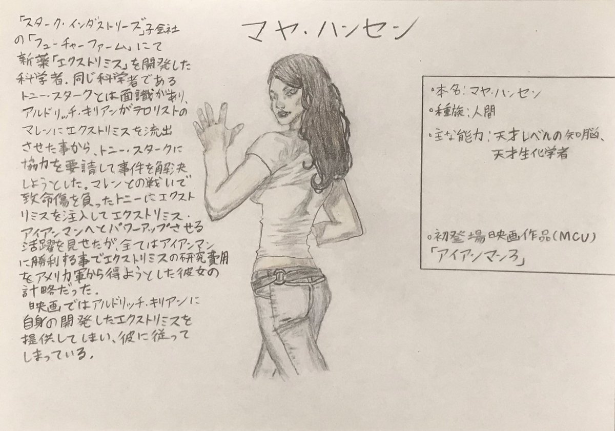 手描きMCUヒーロー列伝 マヤ・ハンセン ・本名:マヤ・ハンセン ・種族:人間 ・能力:天才的な知能、天才科学者 ・初登場映画作品(MCU) 『アイアンマン3』 #marvel #MCU #illust #シャンチー #芸術同盟 #絵描きさんと繋がりたい #絵描きの輪 #みんなで楽しむTwitter展覧会