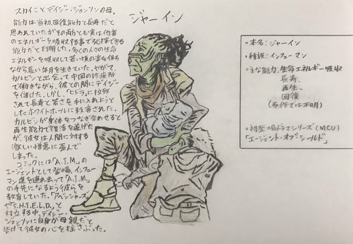 手描きMCUヒーロー列伝 ジャーイン ・本名:ジャーイン ・種族:インフューマン ・能力:生命エネルギー吸収、長寿、回復 ・初登場ドラマ作品(MCU) 『エージェント・オブ・シールド』 #marvel #illust #シャンチー #芸術同盟 #絵描きさんと繋がりたい #絵描きの輪 #みんなで楽しむTwitter展覧会