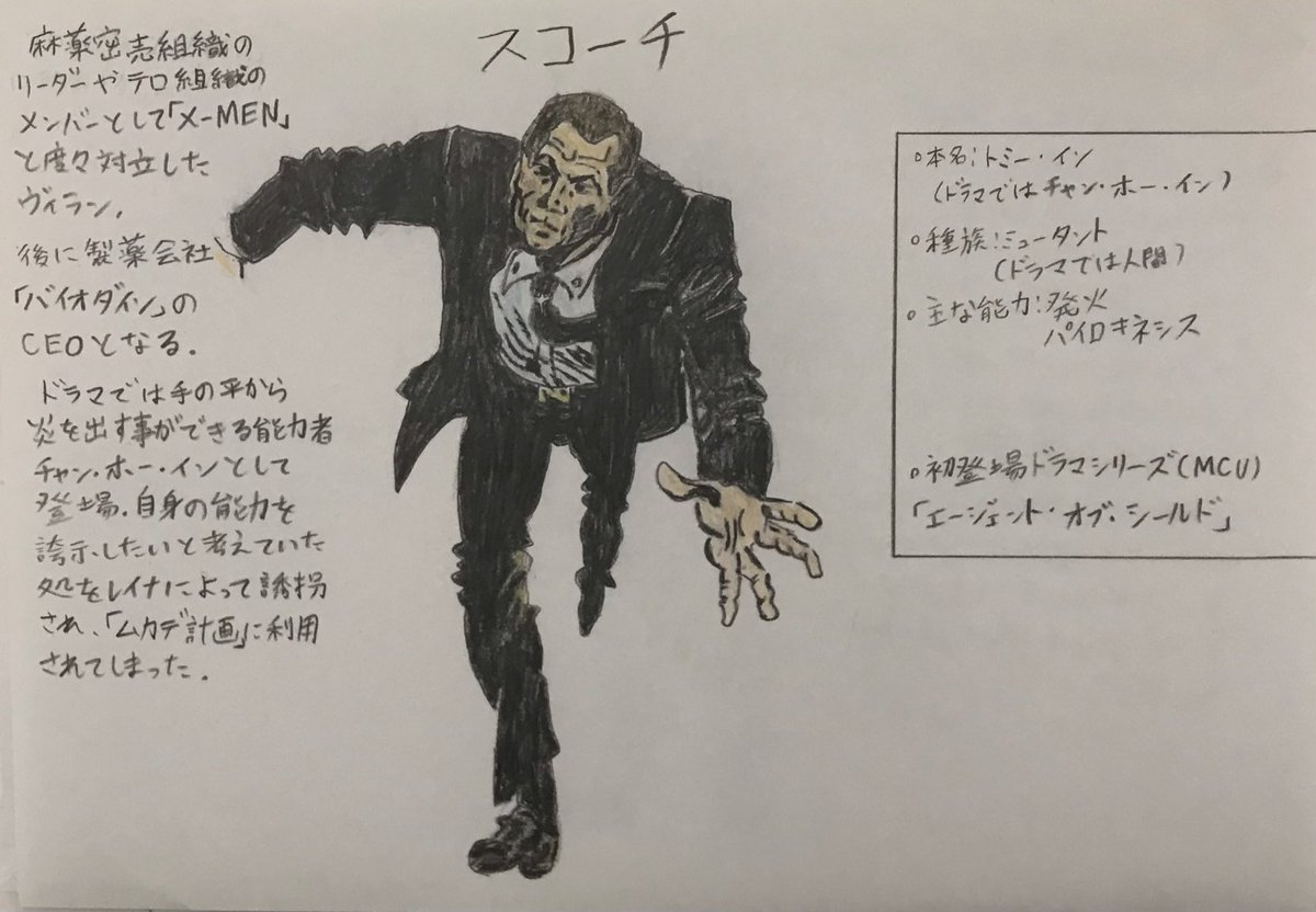手描きMCUヒーロー列伝スコーチ ・本名:トミー・イン(チャン・ホー・イン) ・種族:ミュータント(人間) ・能力:発火、パイロキネシス ・初登場ドラマ作品(MCU) 『エージェント・オブ・シールド』 #marvel #絵 #シャンチー #芸術同盟 #絵描きさんと繋がりたい #絵描きの輪 #みんなで楽しむTwitter展覧会