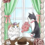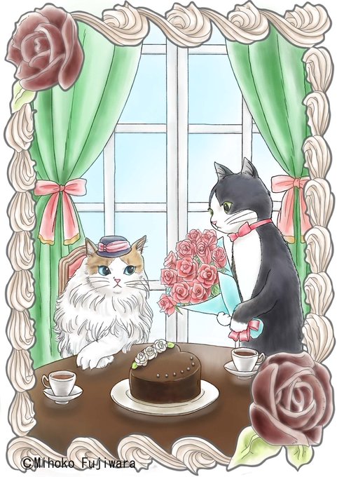スイーツと同じ名前の薔薇のイラスト第3弾です🌹 ショコラという名にちなみ、ガトーショコラを前にショコラの薔薇の花束を贈る猫さんを描きました🐱 ほんの少し大人っぽい雰囲気で🥰💕 #猫 #猫イラスト #猫と薔薇のイラスト #ショコラ #ハチワレ #ラグドール #猫好きさんと繋がりたい #薔薇