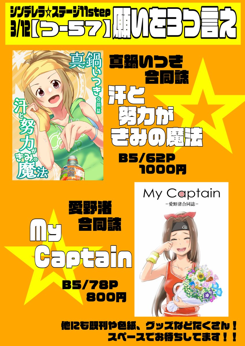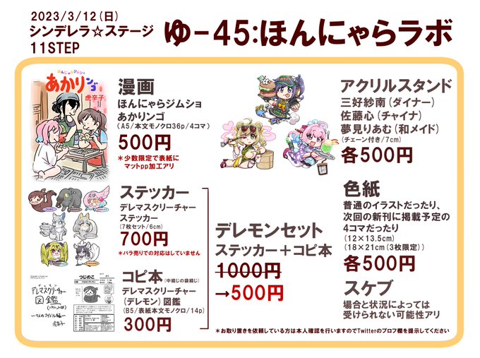 明日3/12(日)開催シンステのおしながき(改訂版)です。 re:barnaは新作グッズ(みりあ/智絵里)、cadenza:は新刊U149コピー本あります!(追加で結城晴アクリルプレートも持っていくことにしました) 【み-33,34 cadenza:&re:barna】でお待ちしてます。 #シンステ #cin_stage