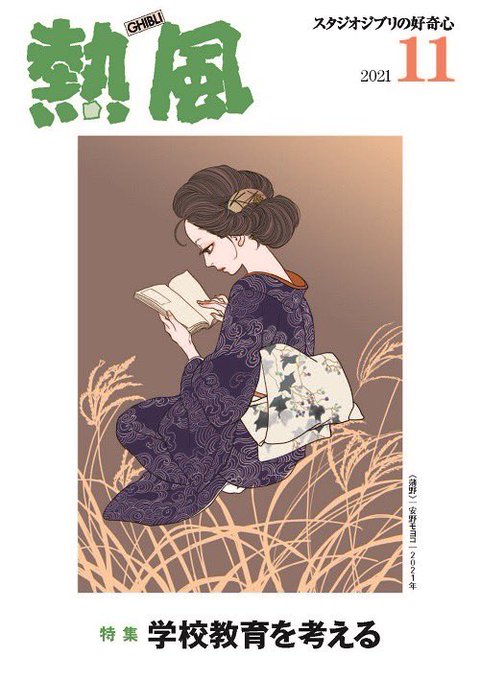 安野モヨコ が表紙を描いた #スタジオジブリ の機関誌「熱風」 11月号、本日発行です❗️ 波柄の着物に、野葡萄の帯の KIMONO GIRL。 繊細なタッチで描かれた柔らかな髪を 松葉の簪で結いあげています。 「熱風」設置書店はこちらから 👉 ghibli.jp/shuppan/np/007… (スタッフ珠)