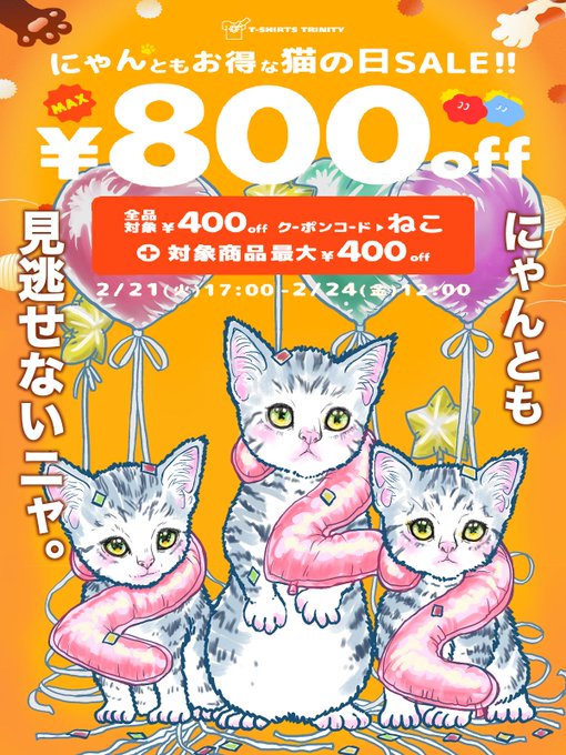 #Tシャツトリニティ #セール 2月21日(火)17:00 ~ 2月24日(金)12:00 全品400円引きクーポン:ねこ +対象商品が最大800円引きに!! nya-mewもよろしくね ttrinity.jp/shop/nya-mew/ #猫 #ねこ #子猫 #イラスト #絵描きさんと繋がりたい #Cats #kitten #猫の日