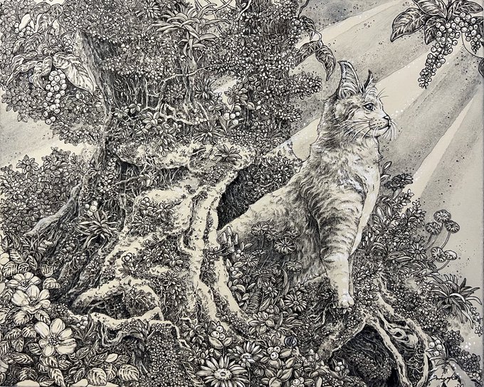 『光さす場所で』 t2y.info/item01/13695.h… とても気に入っている作品です。 モノトーンペン画は、どうしても写真では伝わらない部分があってもどかしいですが… 明るい日の光を、雨が止むその時を、少しでも感じて頂ければ幸いです。 #タツセレ2022 #ペン画