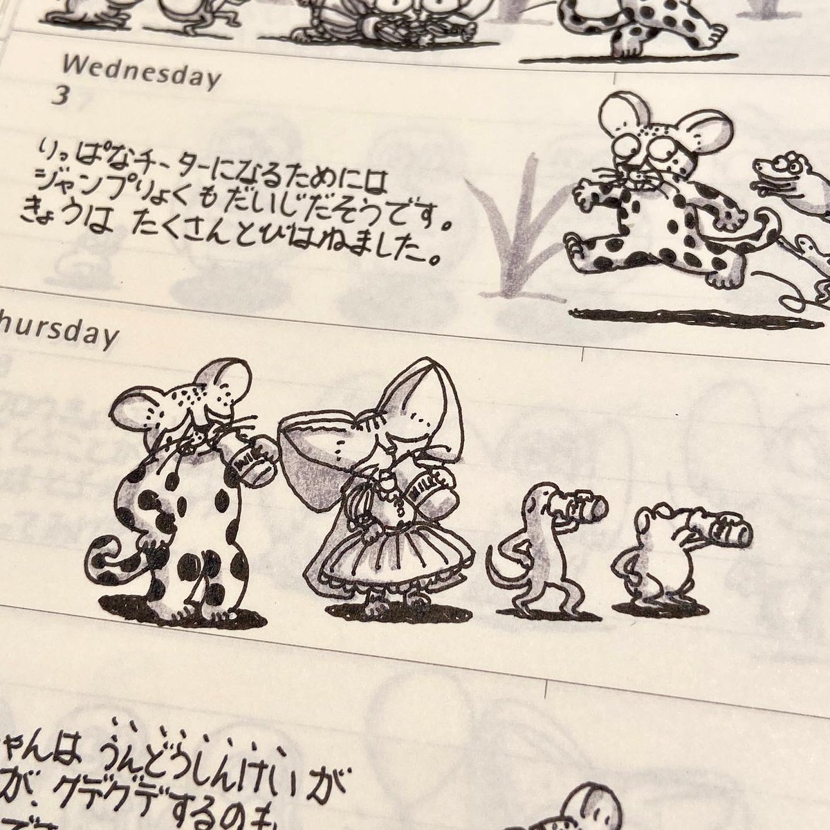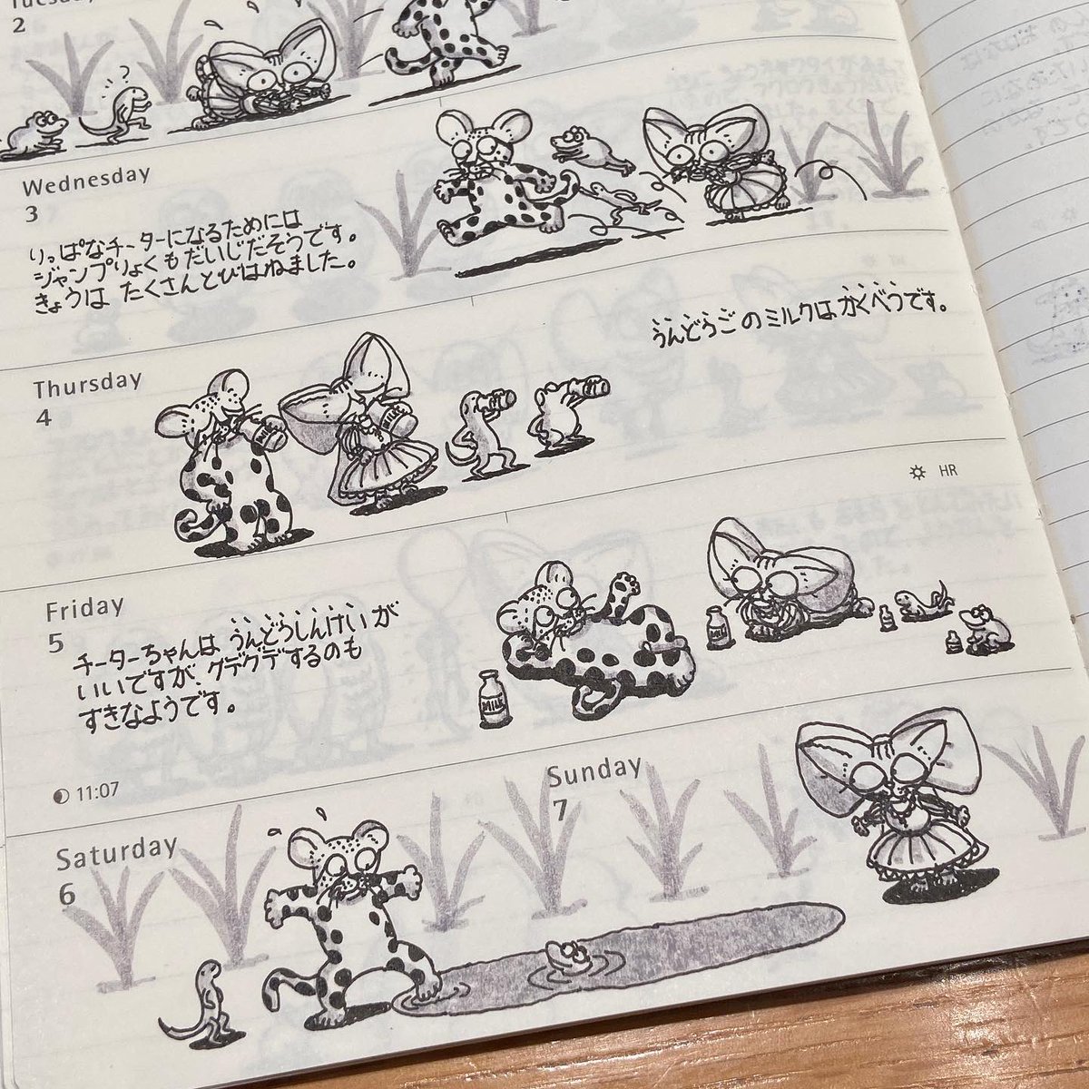 先週分の「ミーシャちゃんの日記」 ミーシャちゃんと チーターちゃん #チーター #猫 #猫イラスト #絵 #イラスト #絵描きさんと繋がりたい #イラスト好きな人と繋がりたい #モレスキン #手帳 #ミーシャちゃんの日記
