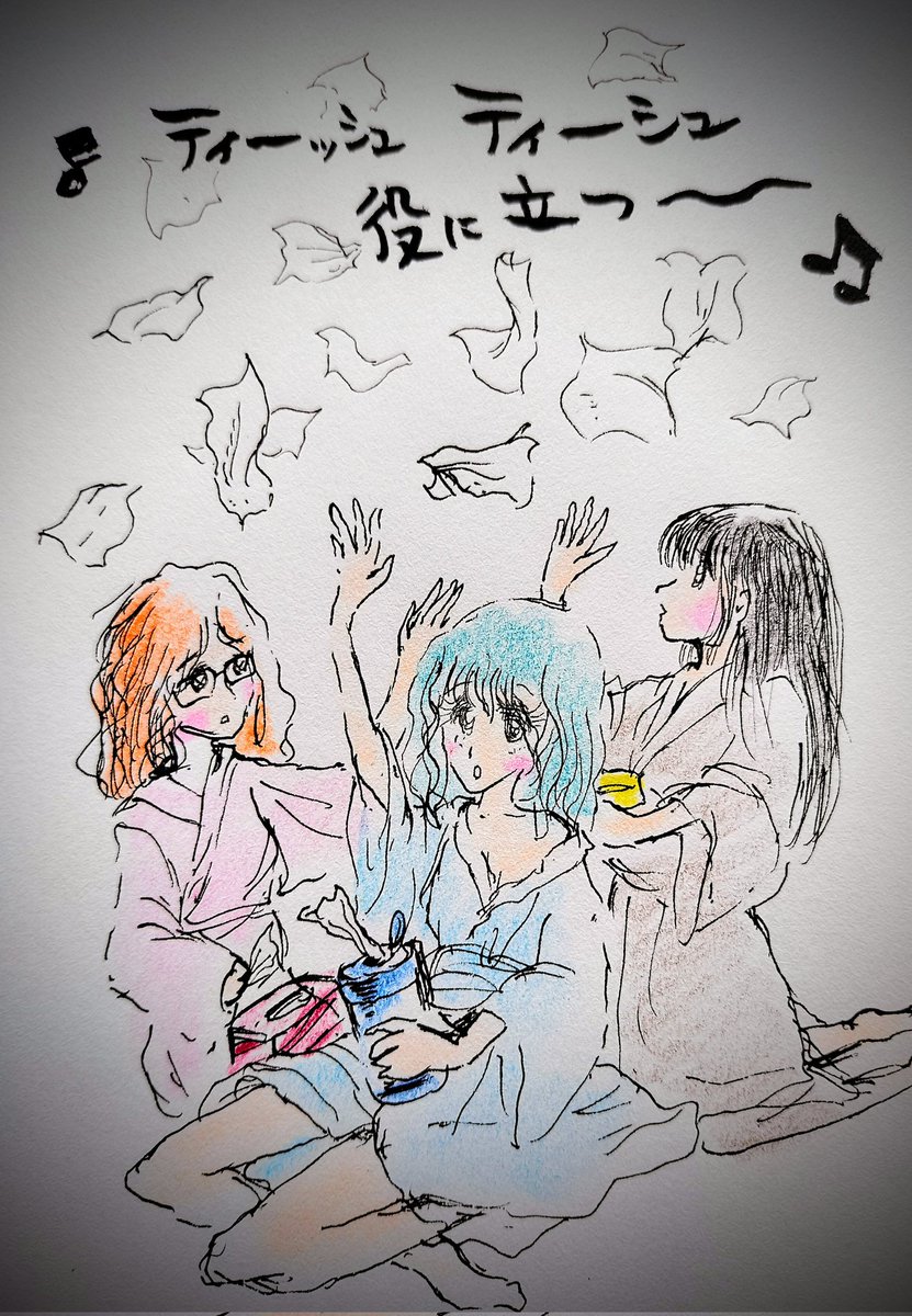 今日お届けするゴキゲンなナンバーは1986年に新潟でスマッシュヒットを記録した「ティッシュはすぐに捨てないで」、歌うは幻のユニット、スリーティッシーズです! #イラスト #絵描きさんと繋がりたい #新潟 #ティッシュ #ポケットティッシュ #ウェットティッシュ #ティッシュティッシュ役に立つ