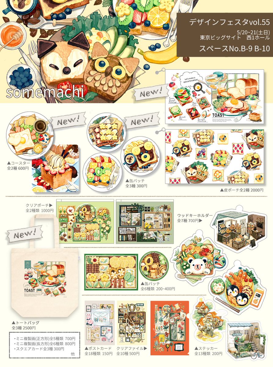 【出店情報】 【#デザインフェスタ55】のお品書きです。 今回も3枚目のお家イラストのパネルが目印です! (ここに載っていない直前に届くグッズは後日写真で紹介します) 出店日 【5/20~21(土日両日)】 スペース【西1ホールNo.B-9 B-10】 出展名 【somemachi】 #デザフェス55 #デザフェスお品書き