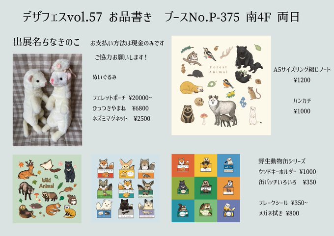 デザフェスお品書き✍ ステッカーとポーチ、それからクリーニングクロスは猫ちゃん柄が新作です。 ブース「A-208」でお待ちしてます。 2日間よろしくお願いします~! #デザフェス57 #デザフェスお品書き