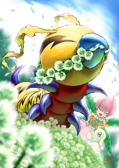 お題箱より~「可愛いクネモン」!お花畑でキャッキャして~! #デジモン #デジタルモンスター #クネモン #リリモン #プロットモン pixiv.net/artworks/10118…