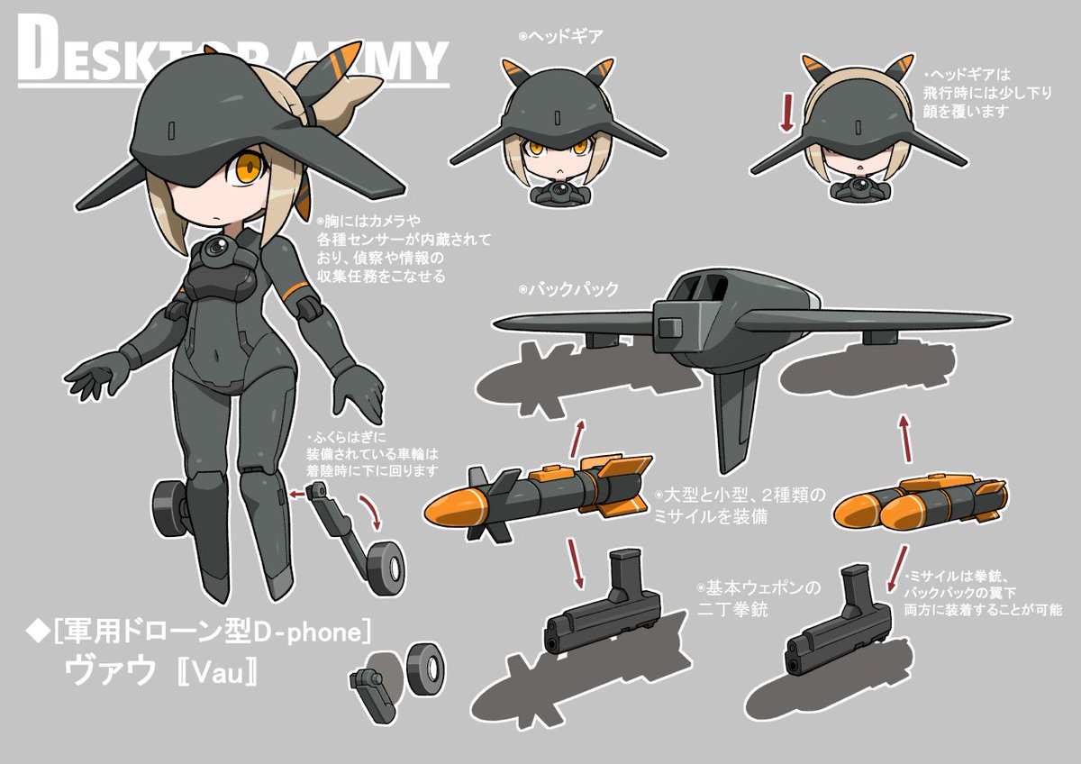 【コンテスト参加】 【応募条件に同意します】 #デスクトップアーミー D-phone名:ヴァウ(Vau) 軍用ドローン型のD-phone。 空中からの大小ミサイルによる 攻撃のほか、胸にあるカメラや各種センサーにより情報収集任務もこなす
