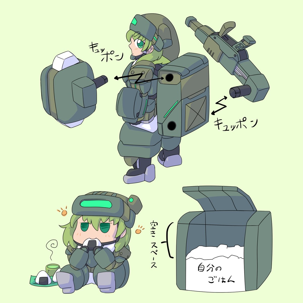 【コンテスト参加】【応募条件に同意します】#デスクトップアーミー 「トレンポルト」 頼まれればなんでもどこへでも持っていく戦場の運び屋。信頼性は抜群だが、荷物を入れる大容量バックパックは常に半分ほどが自分のごはんで埋まっており、あいてるとこに入る荷物しか運んでくれない。