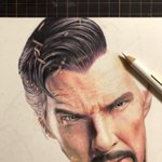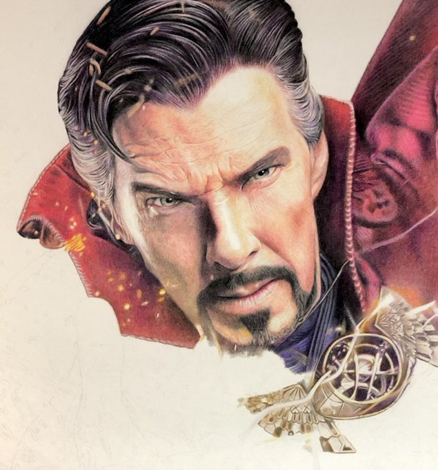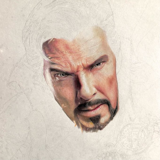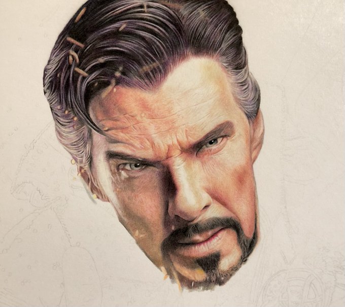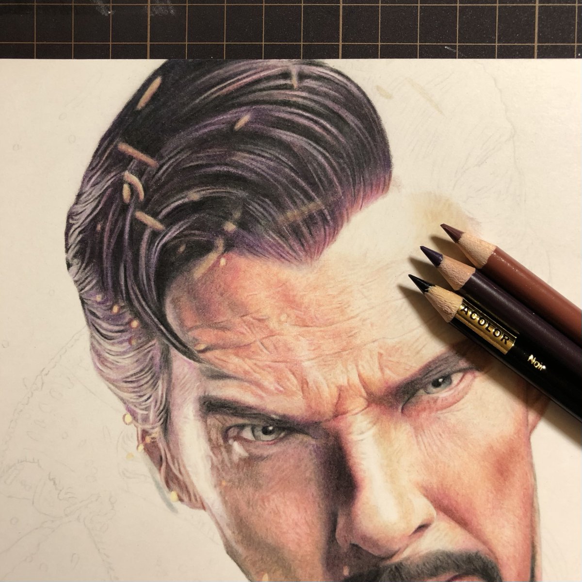 【髪の毛こんな風に描いてますのやつ】 ①とりあえずぐりぐり塗っていい感じにする ②カッターで削り、白や明るい色でぼかす ③黒や暗い色などで塗り、メリハリをつける ④最後に白で仕上げ #色鉛筆 #ドクターストレンジ