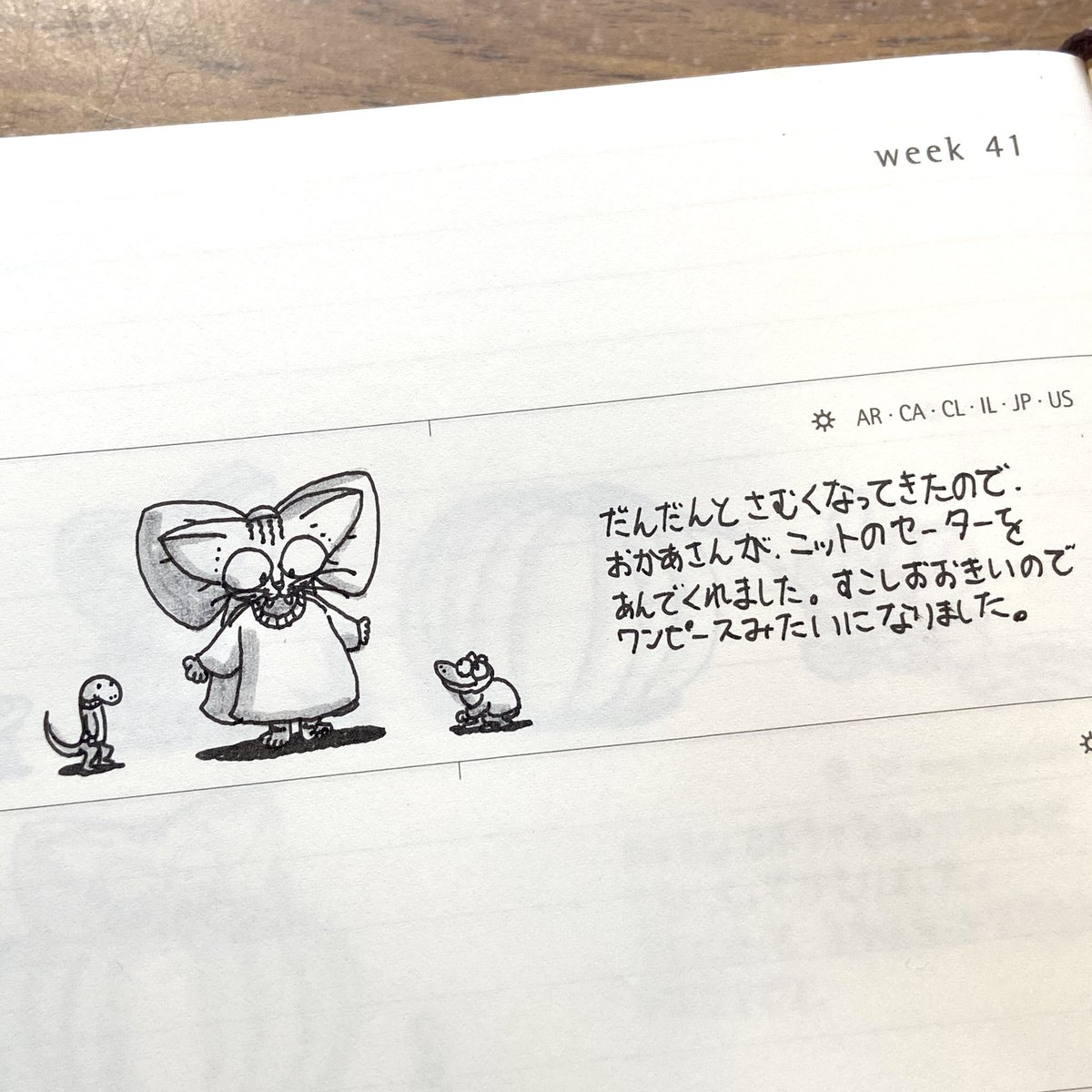 「ミーシャちゃんの日記」 ミーシャちゃんとニット #ニット #猫 #猫イラスト #絵 #イラスト #絵描きさんと繋がりたい #イラスト好きな人と繋がりたい #モレスキン #手帳 #ミーシャちゃんの日記