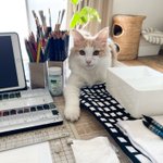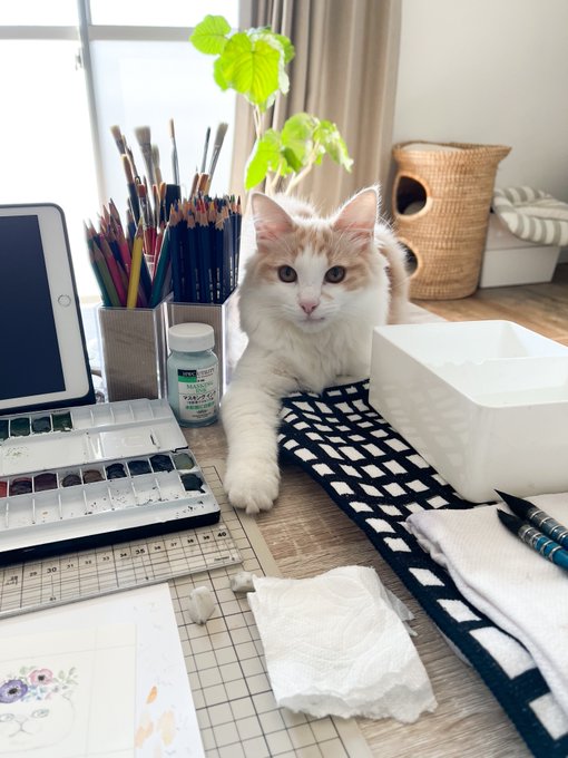お仕事見学に来たちゃたろう🐱 可愛いけど、描いてるところに猫パンチが飛んでくるんじゃないかとハラハラします😅 #ねこのいる暮らし #猫好きさんと繋がりたい #子猫 #ノルウェージャンフォレストキャット #イラスト