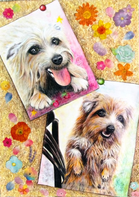 御依頼作品。 #ノーフォークテリア という ちょっと珍しい犬種。 2頭 立て続けに #虹の橋 🌈 を渡ってしまわれたとの事で 精一杯 ご冥福を お祈りしながら描かせて頂きました。 ✍️💓💞 背景の #コルクボード は なかなかの苦心作です❣️😅 #色鉛筆画 #LuxembourgArtPrize2021 #認定絵師